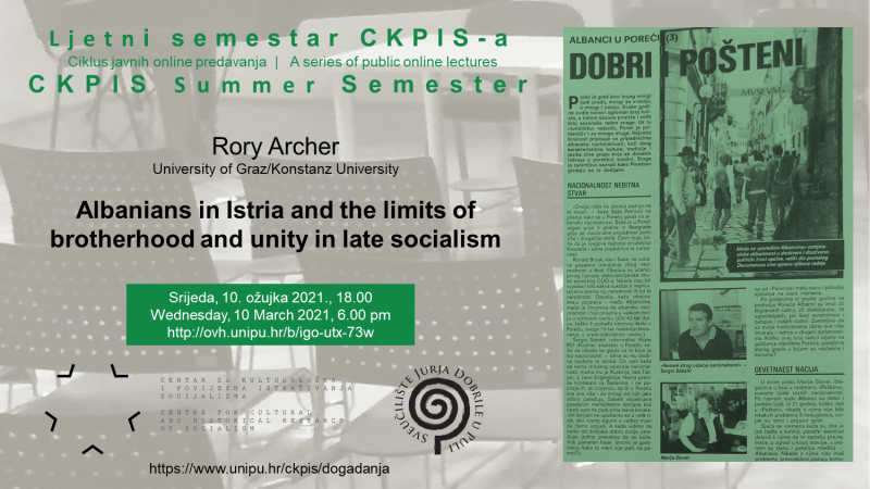 Nakon sedam predavanja u zimskom semestru Centar za kulturološka i povijesna istraživanja socijalizma pokreće novi niz javnih online predavanja u programu Ljetni semestar CKPIS-a. Prvi gost je Rory Archer, predavač na Sveučilištu u Konstanzu i voditelj projekta „To the Northwest! Intra Yugoslav Albanian migration (1953-1989)“ na Sveučilištu u Grazu. Na predavanju će govoriti o migracijama radnika Albanaca s Kosova i iz Makedonije prema Istri 1980-ih, u vrijeme kada je albansko nezadovoljstvo na Kosovu u ostatku Jugoslavije opisivano kao kontrarevolucija i iredentizam. Oprez i sumnjičavost prema doseljenicima primjećuju se u općinskim komitetima SKH, Službi državne sigurnosti i lokalnim medijima.