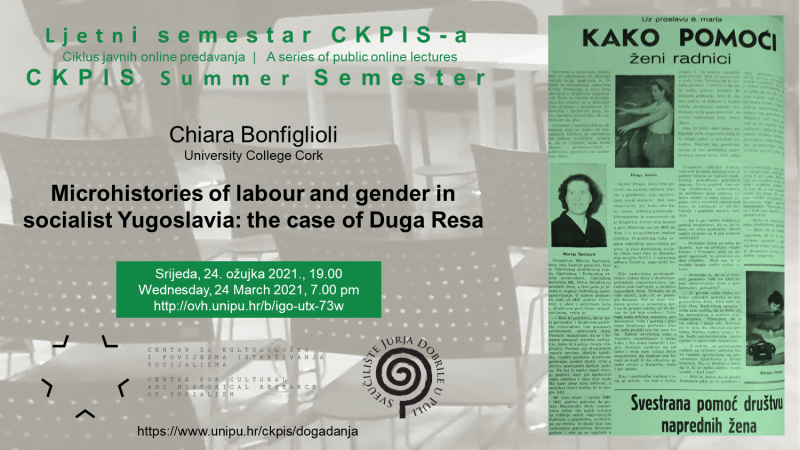 Druga gošća Ljetnog semestra CKPIS-a je Chiara Bonfiglioli, predavačica rodnih i ženskih studija na Sveučilišnom koledžu Cork u Irskoj, autorica knjige „Women and Industry in the Balkans: The Rise and Fall of the Yugoslav Textile Sector“ te suradnica CKPIS-a i projekta Mikrosocijalizam (HRZZ). Na predavanju će govoriti o vrijednosti arhivskih izvora za mikrohistoriju rada i roda na primjeru djelovanja Konferencije za društvenu aktivnost žena (KDAŽ) u Dugoj Resi, tamošnjoj industriji i općinskim tijelima od šezdesetih godina nadalje.
