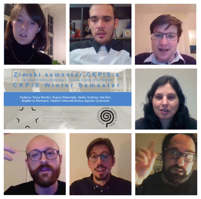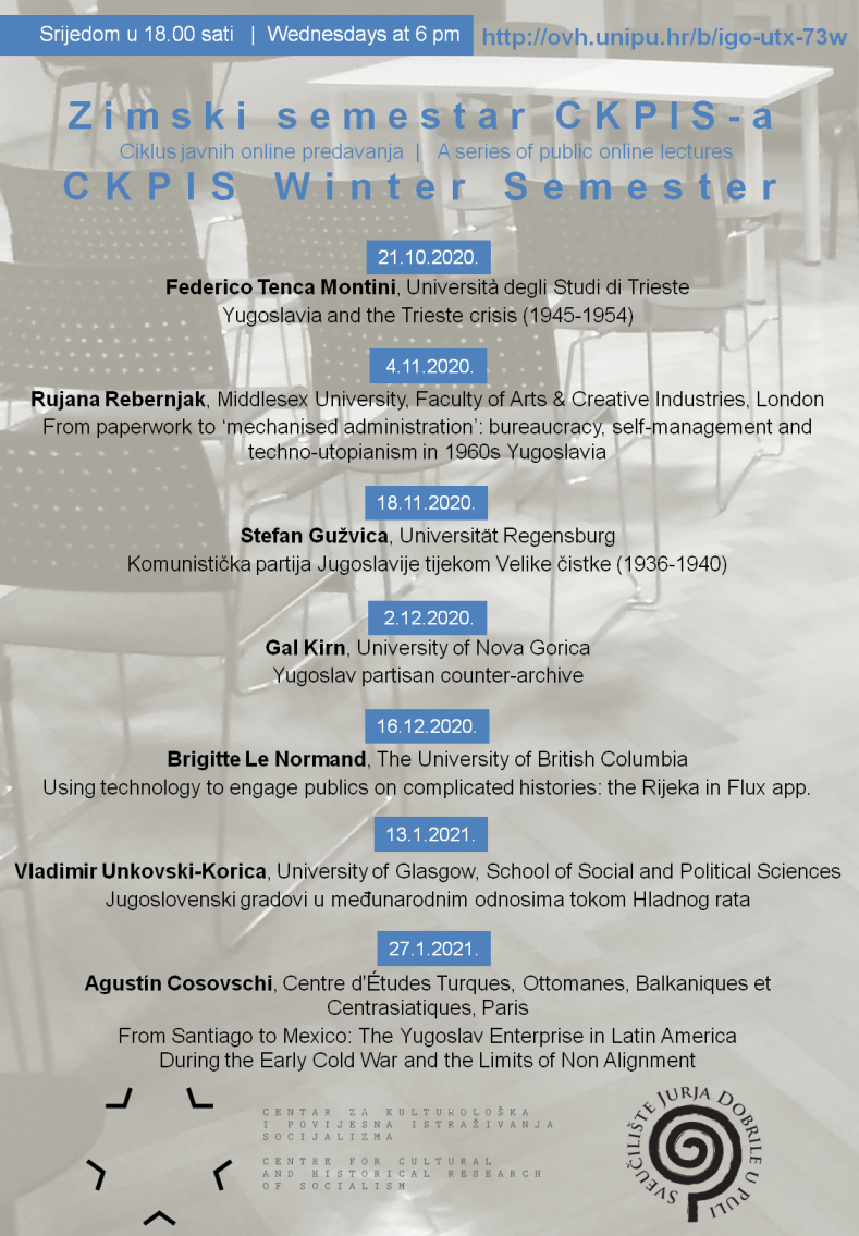 Od listopada 2020. do siječnja 2021. u ciklusu online predavanja pod nazivom Zimski semestar CKPIS-a naši gosti bili su Federico Tenca Montini (Yugoslavia and the Trieste crisis), Rujana Rebernjak (From paperwork to ‘mechanised administration’: bureaucracy, self-management and techno-utopianism in 1960s Yugoslavia), Stefan Gužvica (Komunistička partija Jugoslavije tijekom Velike čistke), Gal Kirn (Yugoslav partisan counter-archive), Brigitte Le Normand (Using technology to engage publics on complicated histories: the Rijeka in Flux app), Vladimir Unkovski-Korica (Cities in Yugoslav foreign policy during the Cold War) i Agustín Cosovschi (From Santiago to Mexico: The Yugoslav Enterprise in Latin America During the Early Cold War and the Limits of Non Alignment). Predavači su se uključivali iz Udina, Londona, Rijeke, Berlina, Kelowne, Glasgowa i Pariza, a publika iz Europe, Sjeverne i Južne Amerike, možda i šire. Zahvaljujemo predavačima, svim kolegicama i kolegama koji su svojim pitanjima pridonosili zanimljivosti rasprave te bili dio brojne publike koja je svake druge srijede posjećivala našu virtualnu dvoranu.