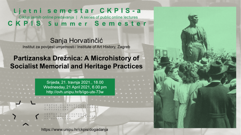 U četvrtom terminu Ljetnog semestra CKPIS-a gostuje Sanja Horvatinčić s Instituta za povijest umjetnosti u Zagrebu, čije će se predavanje o mikrohistoriji memorijalnih i baštinskih praksi u socijalističkoj Jugoslaviji temeljiti na njezinom istraživanju u sklopu međunarodnog interdisciplinarnog projekta Heritage from Below / Drežnica: Traces and Memories 1941-1945, koji se provodi na Institutu za povijest umjetnosti u Zagrebu (2019-2022).