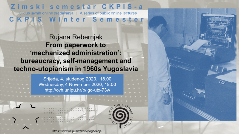 Drugo predavanje u ciklusu Zimski semestar CKPIS-a održat će Rujana Rebernjak, predavač povijesti dizajna i vizualne kulture na Sveučilištu Middlesex, kulturna povjesničarka koja je doktorirala na Royal College of Art. U predavanju će prikazati razvoj diskursa o automatizaciji i kibernetici samoupravljanja u Jugoslaviji 1960-ih, uz osvrt na zagrebačku tvornicu Rade Končar i njezin eksperiment u mehanizaciji administracije. Naime, od uvođenja samoupravljanja 1950. u Jugoslaviji se nastojala provoditi debirokratizacija, a šezdesetih je tehnoutopistička ideja o „mehaniziranoj administraciji“ i automatiziranoj obradi podataka postala novo sredstvo u ideološkom ratu protiv birokracije. Predavanje će biti održano na engleskom jeziku u virtualnoj dvorani.