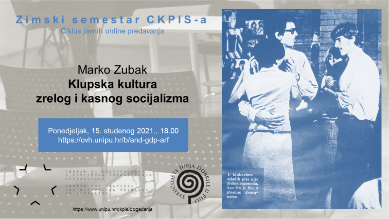 Marko Zubak prvi je gost Zimskog semestra CKPIS-a u ovoj akademskoj godini. Predavanje pod naslovom Klupska kultura zrelog i kasnog socijalizma održat će u ponedjeljak, 15. studenog 2021., u 18.00 sati u virtualnoj dvorani https://ovh.unipu.hr/b/and-gdp-arf.
