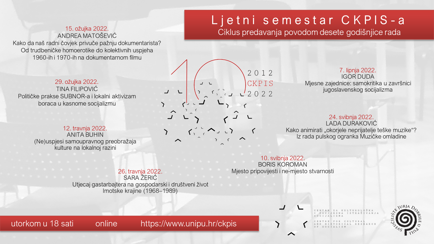 Poslije sedam javnih online predavanja u ciklusu Ljetni semestar CKPIS-a, kojima smo predstavili dio naših istraživanja, poslije tribine održane prošloga mjeseca u sklopu Festivala povijesti Kliofest u Nacionalnoj i sveučilišnoj knjižnici u Zagrebu te poslije niza intervjua u našem mjesečnom Newsletteru (koji se nastavljaju i dalje), CKPIS u utorak, 14. lipnja 2022., u 11.00 sati u Sveučilišnoj knjižnici u Puli zaokružuje obilježavanje desete godišnjice svojega rada (Deset godina). Uz predstavljanje ukupne djelatnosti Centra, održat će se i okrugli stol Perspektive kulturoloških i povijesnih istraživanja socijalizma.