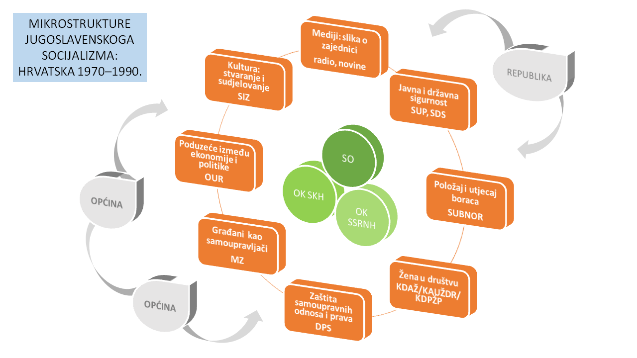 Sedamdesete i osamdesete godine vrijeme su u potpunosti oblikovanoga socijalističkog sustava u kojem je samoupravljanje primijenjeno na svim razinama i u kojemu se razvija ideja slobodno udruženoga rada s namjerom odumiranja države i prepuštanja njezinih ovlasti samoupravnim zajednicama i organizacijama. Očekivano je bilo aktiviranje radnih ljudi i građana kroz neposredne i posredne oblike socijalističke demokracije, od referenduma i zbora građana do delegata u tijelima udruženoga rada i skupštinama društveno-političke zajednice. Primjena samoupravljanja značila je ne samo deetatizaciju, već i decentralizaciju, odnosno jačanje nižih razina vlasti ispod savezne i republičke, dakle mjesne zajednice, općine i zajednice općina. Općina je u Ustavu iz 1963. opisana kao osnovna društveno-politička zajednica, a 1974. postaje samoupravna i osnovna društveno-politička zajednica utemeljena na vlasti i samoupravljanju radničke klase i svih radnih ljudi. Bila je zamišljena kao mala zajednica u kojoj se na mikrorazini aktiviraju sve poluge društvenog i društveno-političkog ustroja. Prema ustavnim i zakonskim rješenjima u općini se stvaraju uvjeti za život i rad te za zadovoljavanje materijalnih, socijalnih, kulturnih i drugih zajedničkih potreba. Udruživanje u zajednice općina predviđeno je Ustavom iz 1974. te će se u Hrvatskoj razviti devet regionalnih središta.