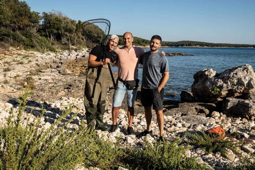 Fotografija 2: Istraživač National Geografica Francesco Marinelli i naši djelatnici izvr. prof. dr. sc. Paolo Paliaga i dr. sc. Neven Iveša tijekom tarenskog rada kada su sakupljeni plavi rakovi u rovinjskom akvatoriju, autorica Elisabetta Zavoli.