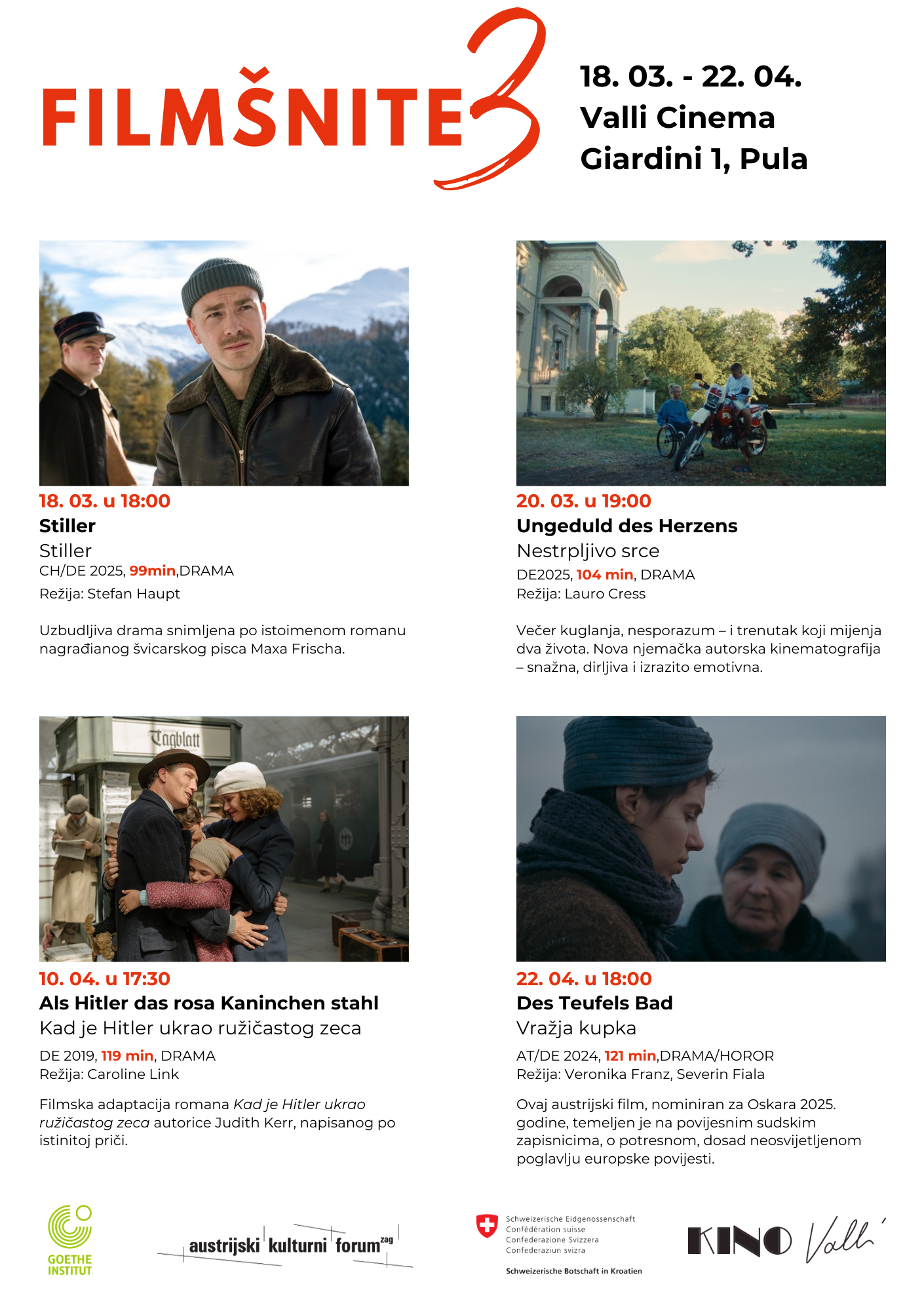 Festival filmova na njemačkom jeziku (uz titlove na hrvatskom jeziku) Filmšnite 3 održava se u Puli, u Kinu Valli, od 18.3.2026. do 22.4.2026. godine u suradnji s Austrijskim kulturnim forumom Zagreb, Goethe-Institutom Hrvatska, Veleposlanstvom Švicarske Konfederacije.